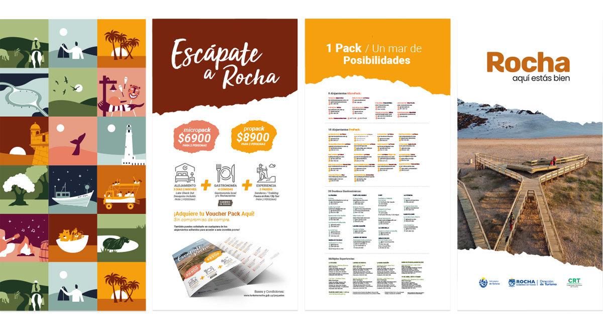 Diseño de toda la comunicación de la campaña "Escápate a Rocha" 2022 de la Dirección de Turismo de Rocha. Diversos materiales para redes sociales. Tríptico con bouchers. Banners para stand de la Rural del Prado. Entre otra gran variedad de piezas.